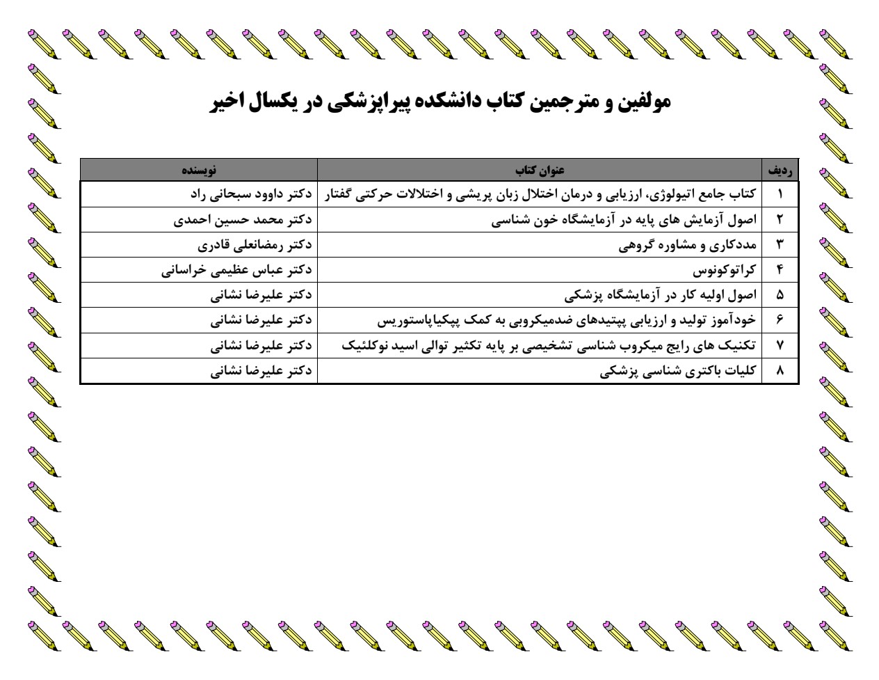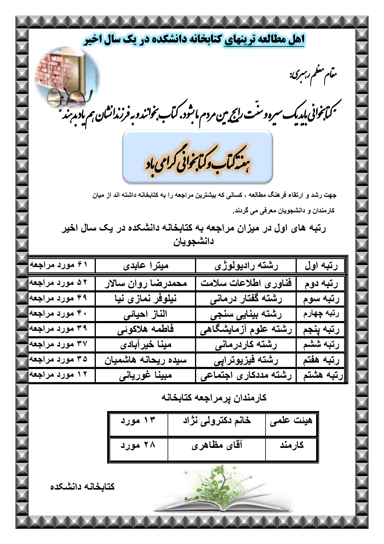 در مراسم "کافه کتاب" که به مناسبت هفته کتاب و کتابخوانی در دانشکده پیراپزشکی مشهد برگزار گردید به پرمراجعین کتابخانه در هر گروه ، همچنین اساتید و کارمندان هدیه و تقدیرنامه و شاخه گل اهدا گردید. همچنین در این مراسم از 5 نفر از مولفین کتاب در یک سال اخیر تقدیر گردید.