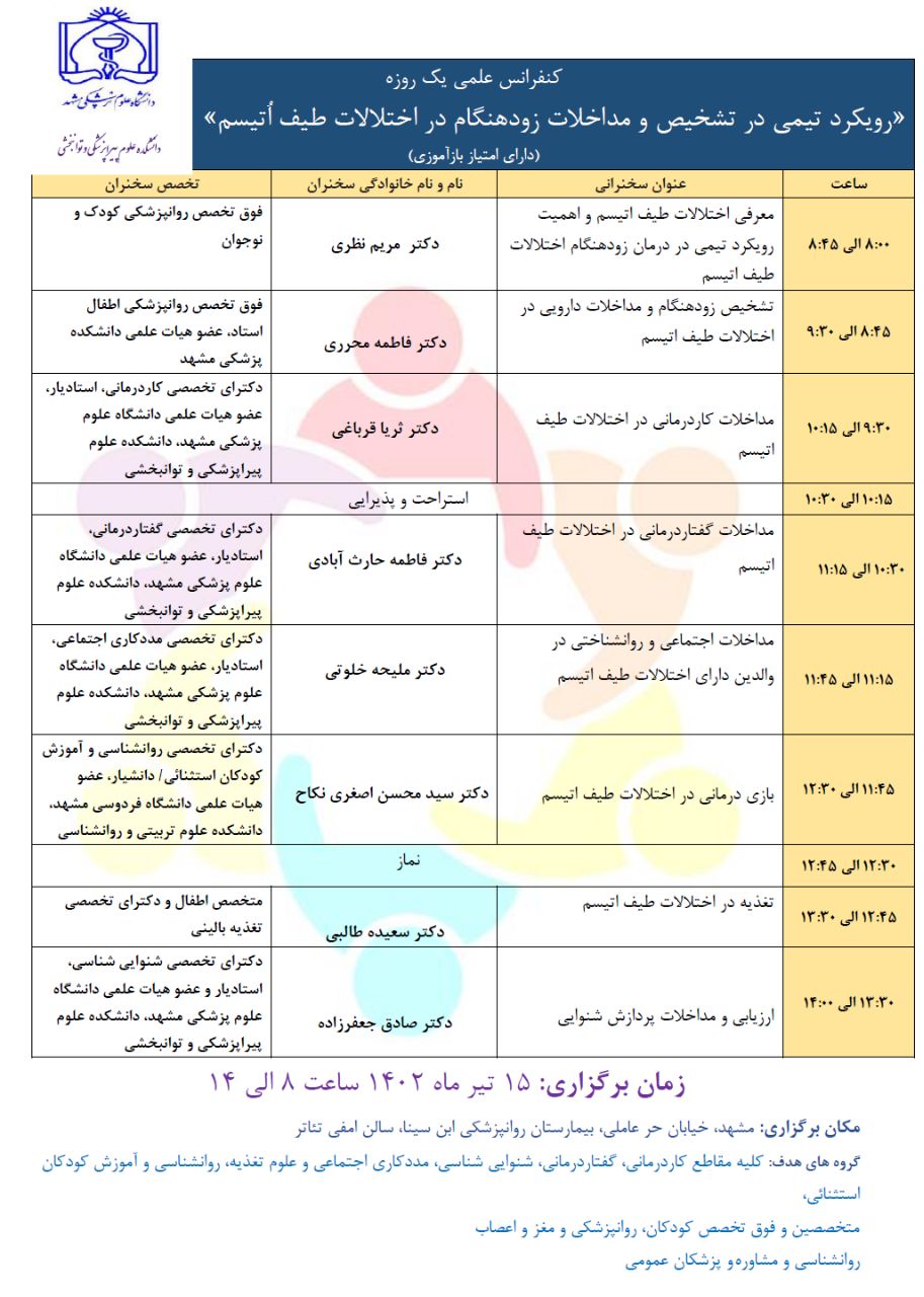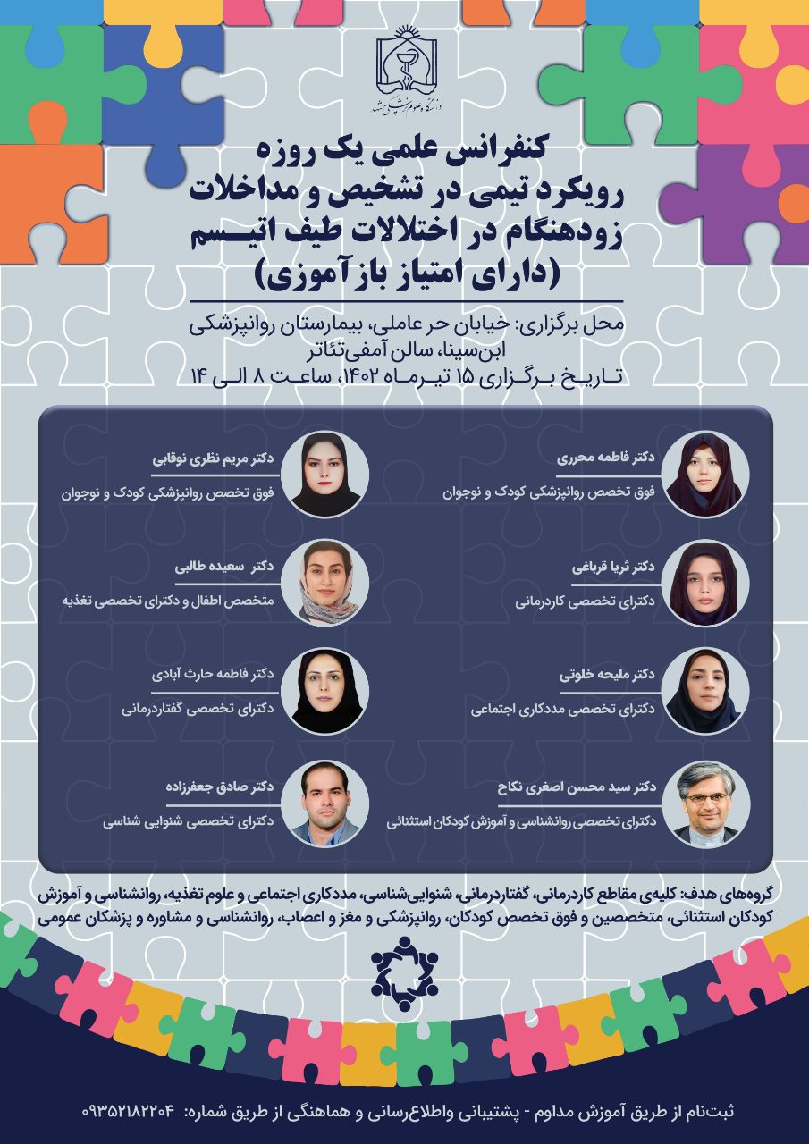 اطلاعیه ها روابط عمومی 13 تیر 1402 13 تیر 1402 بازدید: 110 کنفرانس علمی یک روزه رویکرد تیمی در تشخیص و مداخلات زودهنگام در اختلالات طیف اتیسم