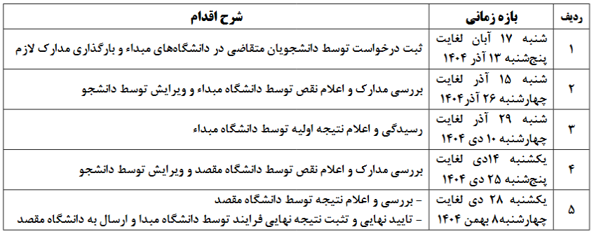 به اطلاع میرساند بازه زمانی مهمانی و انتقال دانشجویان دانشگاه علوم پزشکی جهت نیمسال دوم سال تحصیلی ١٤٠٥-١٤٠٤ براساس جدول ذیل می باشد.