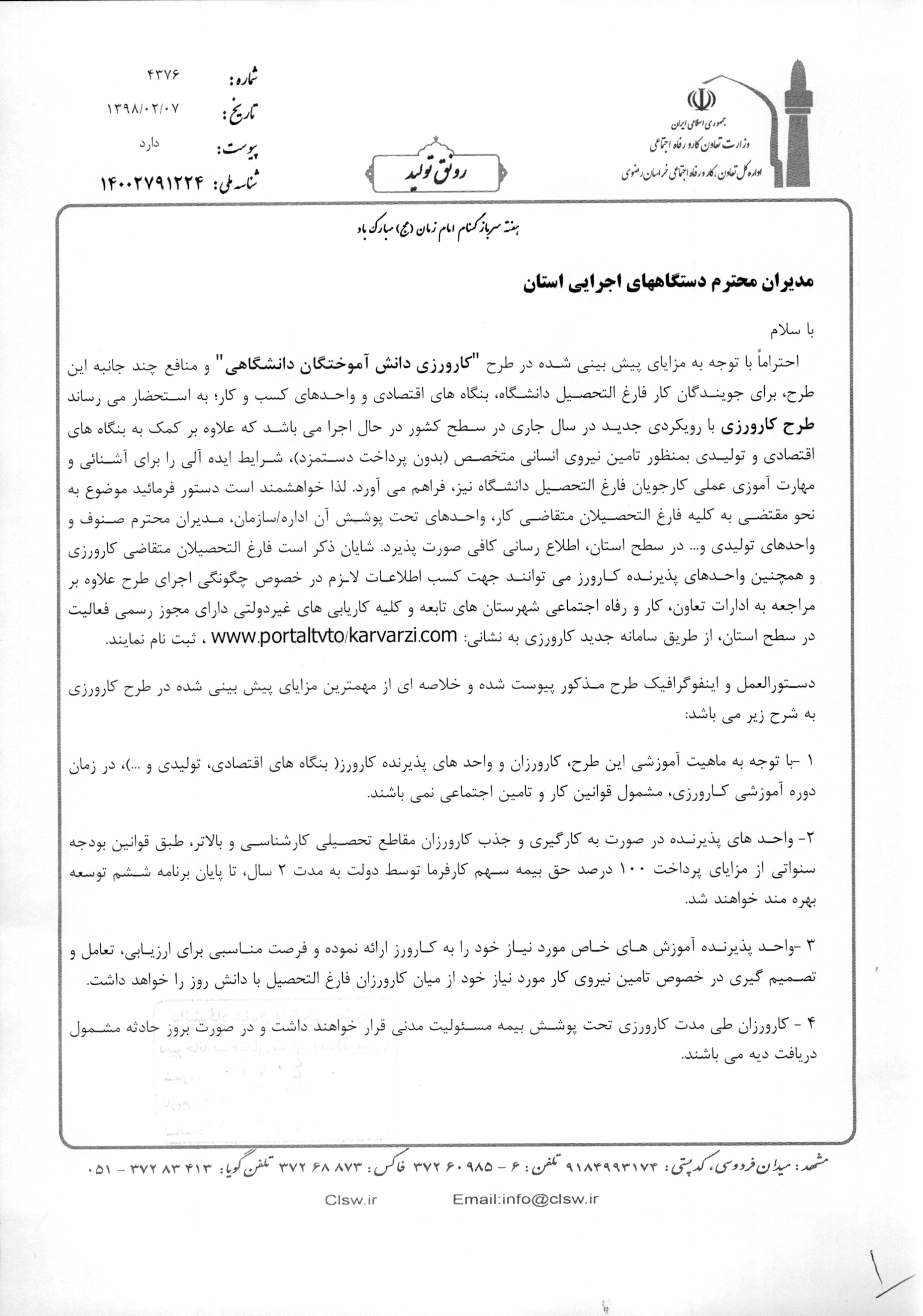 متقاضی کارورزی و همچنین واحدهای پذیرنده کارورز می توانند جهت کسب اطلاعات در خصوص چگونگی اجرای طرح علاوه بر مراجعه به ادارات تعاون، کار و رفاه اجتماعی شهرستان های تابعه و کلیه کاریابی های غیر دولتی دارای مجوز رسمی فعالیت در سطح استان، از طریق سامانه جدید کارورزی به آدرس زیر مراجعه نمایند.