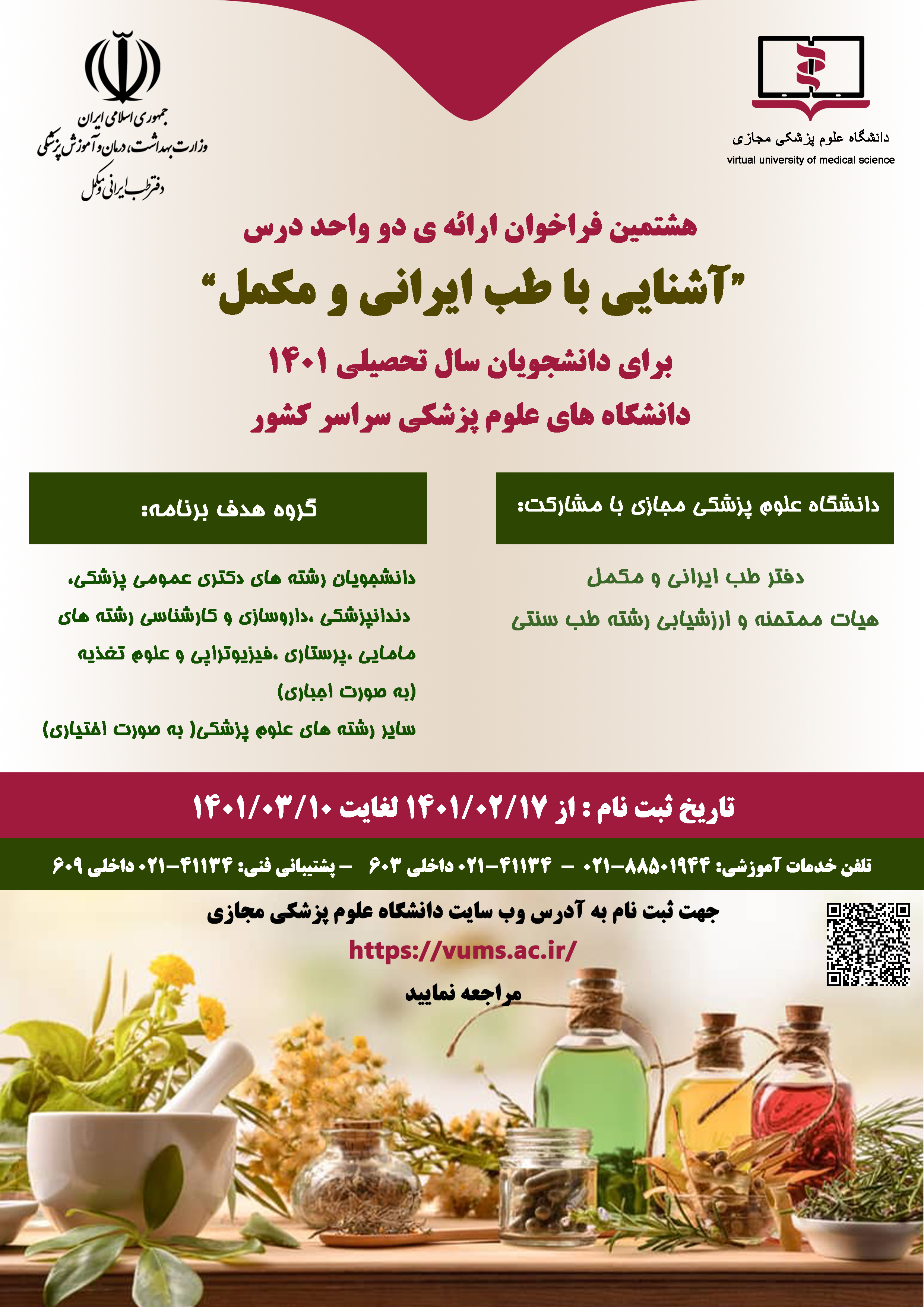 اطلاعیه ها کارشناس آموزش 11 ارديبهشت 1401 11 ارديبهشت 1401 بازدید: 82 اطلاعیه هشتمین فراخوان ارائه درس دو واحدی" آشنایی با مبانی طب ایرانی و مکمل " جهت مطالعه شرایط ثبت نام در اینجا کلیک نمایئد.