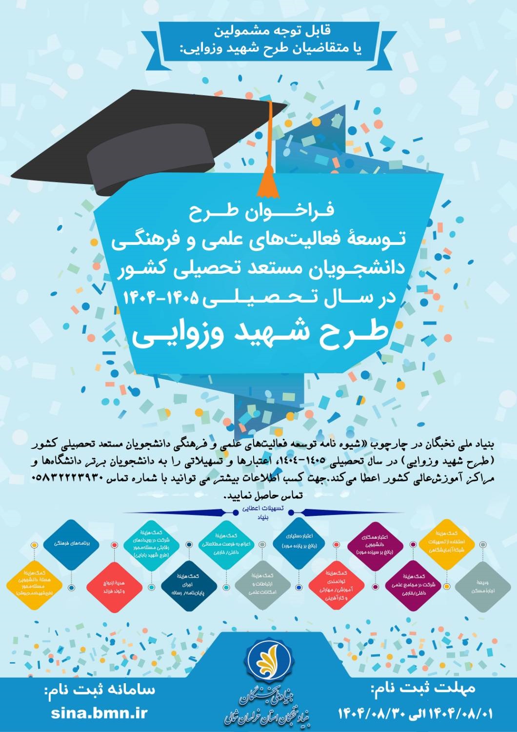 بنیاد ملی نخبگان با هدف توانمندسازی مهارت افزایی و ایجاد زمینه های رشد و شکوفایی حداکثری استعدادهای فردی و گروهی دانشجویان صاحب استعدادهای برتر در قالب «شیوه نامه توسعه فعالیتهای علمی و فرهنگی دانشجویان مستعد تحصیلی کشور" (طرح شهید وزوایی) در سال تحصیلی ۱۴۰۵-۱۴۰۴ تسهیلات متنوعی را به دانشجویان صاحب استعدادهای برتر مشغول به تحصیل در دانشگاها و مراکز آموزش عالی کشور اعطا مینماید.